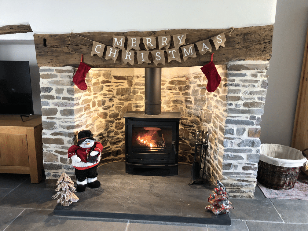 The lounge has a fireplace built of local stone with an efficient wood burning stove, sofa seating for 5 people, a small dining table seating 4 , smart TV and patio doors onto the garden.