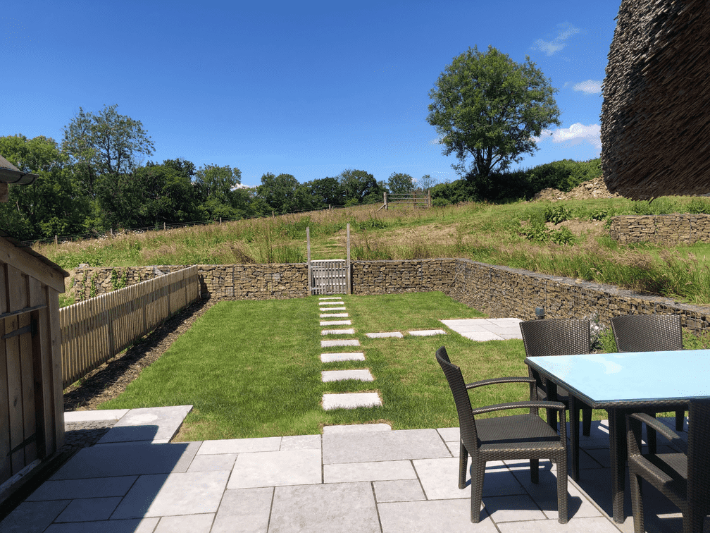 The garden faces West and in the summer gets the sun in the afternoon and evenings with views of our fields behind. It has a patio with seating , the garden is fenced with a Dog shower.