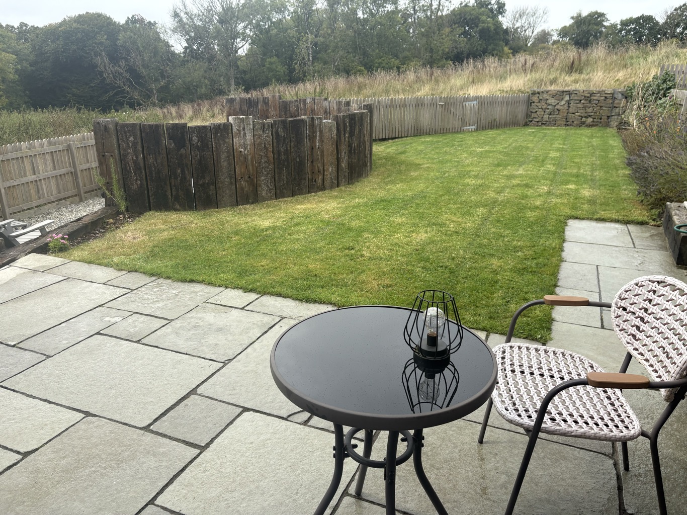 The garden faces West and in the summer gets the sun in the afternoon and evenings with views of our fields behind. It has a patio with seating , the garden is fenced with a Dog shower.