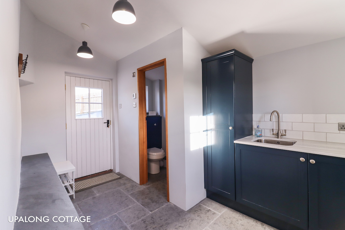 The utility room has a large sink, washer dryer and downstairs toilet (cupboard containing ironing board, iron and foldaway clothes dryer, vacuum)