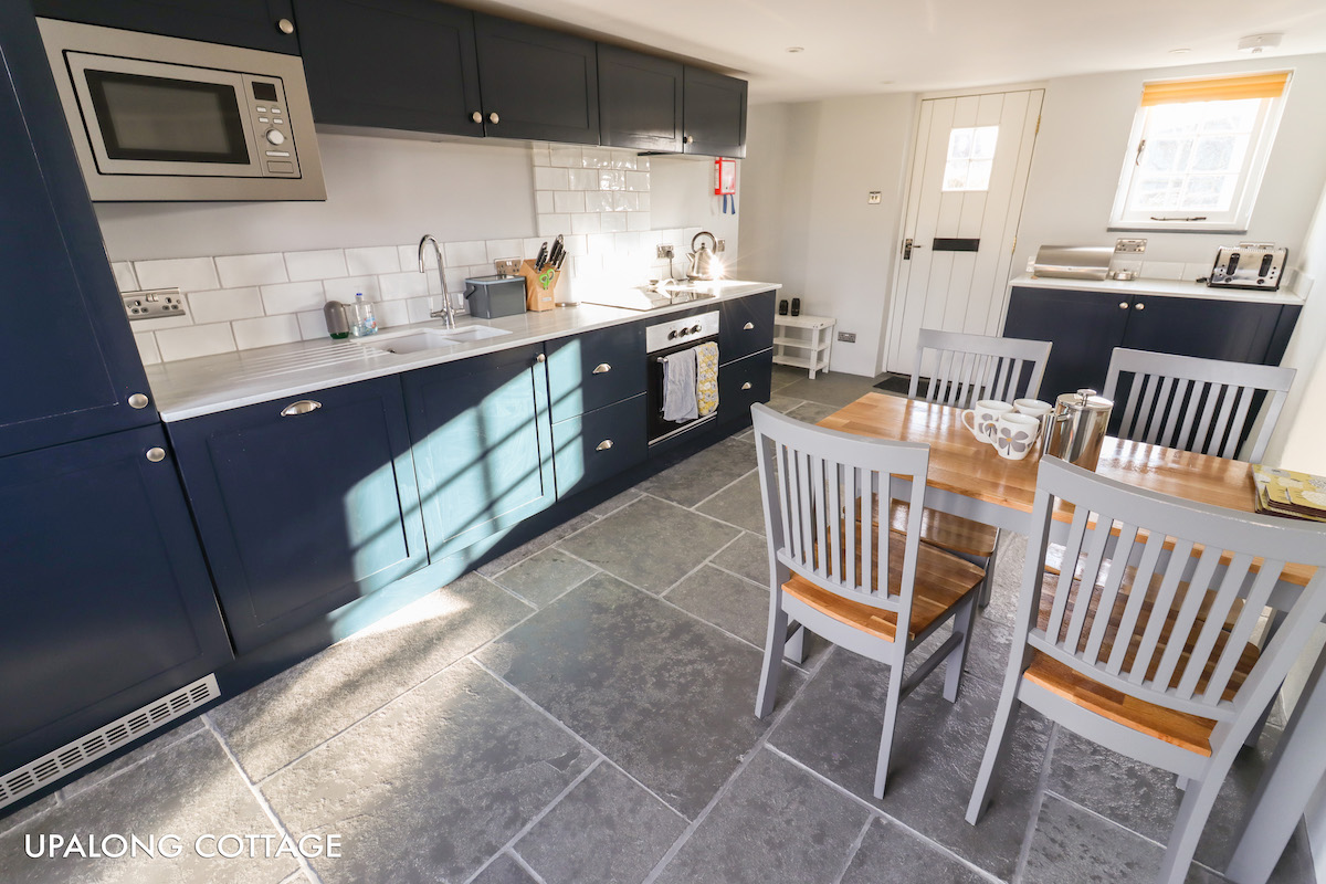 The kitchen has an induction hob, electric oven, microwave, integrated fridge freezer, kettle and toaster plus a full sized dishwasher and dining table with seating for 4 ( can seat 6 on request),